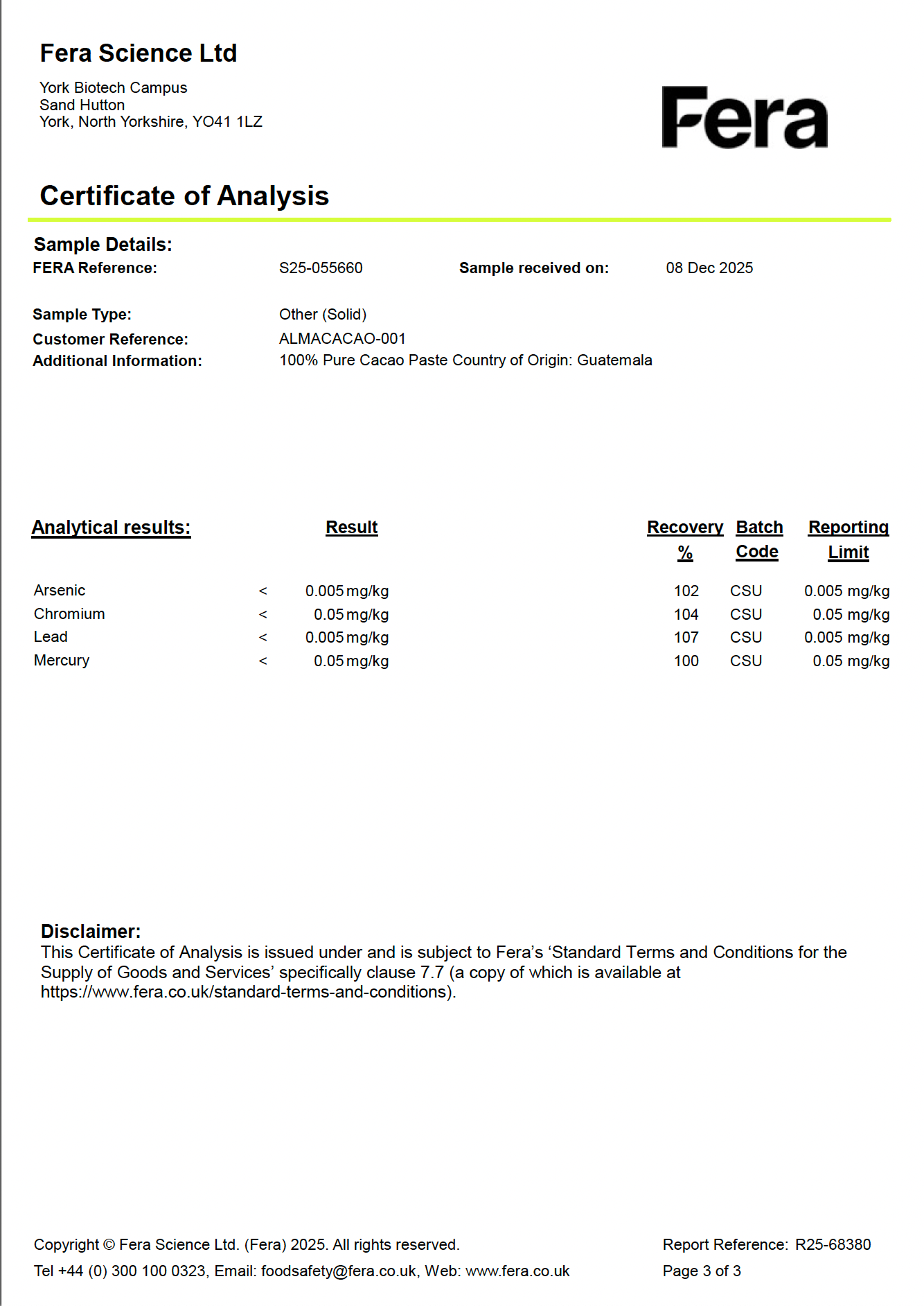 Our cacao is independently lab tested for heavy metals (lead, arsenic, mercury and chromium) by a certified UK-based laboratory. All results demonstrate levels are below detectable limits.